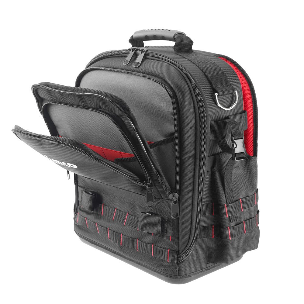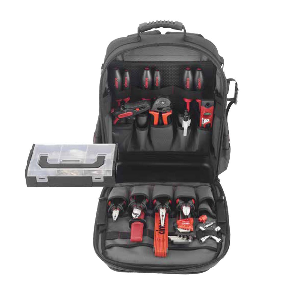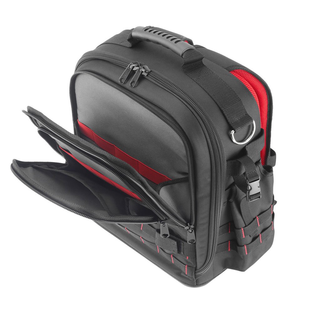 Τέσσερις ξεχωριστές θήκες με φερμουάρ για προστασία εργαλείων ή εξοπλισμού μέτρησης υψηλής αξίας, συμπεριλαμβανομένης της ξεχωριστής θήκης για φορητό υπολογιστή με επένδυση. Εσωτερικές θήκες για επιπλέον αποθήκευση tablet και εγγράφων. Δύο ανοιχτές πλαϊνές τσέπες με ελαστικούς ιμάντες παρέχουν γρήγορη πρόσβαση σε εργαλεία ή μπουκάλι νερού.
