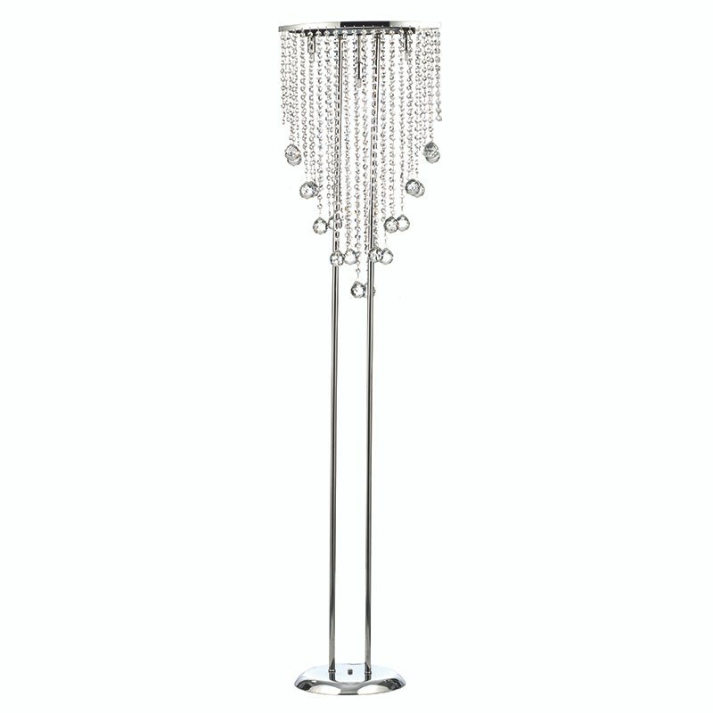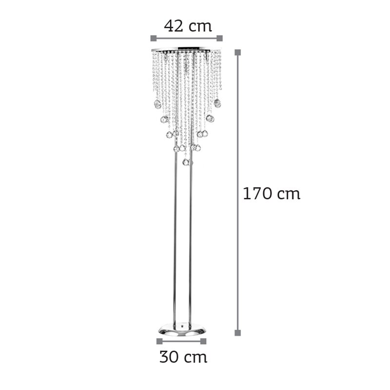 Πρόκειται για ένα χρώμιο μεταλλικό επιδαπέδιο φωτιστικό. Οι τρεις λαμπτήρες καλύπτονται από διάφανα στρογγυλά κρύσταλλα, στο τελείωμα κάποιων υπάρχουν διάφανες μπάλες. Όταν είναι αναμμένο το αποτέλεσμα είναι εντυπωσιακό!