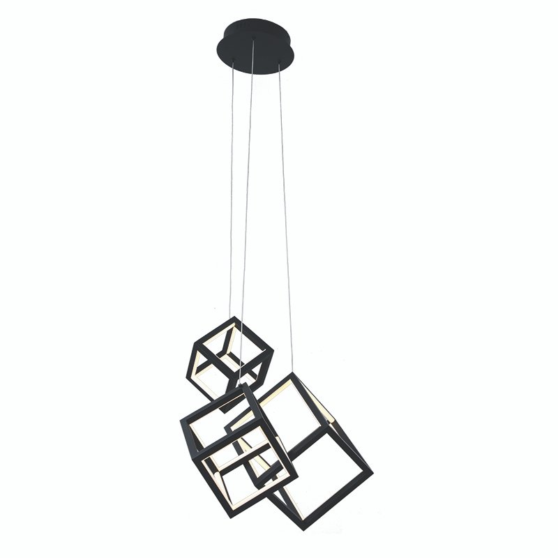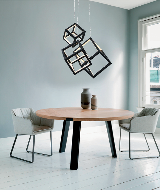 Πρόκειται για ένα μαύρο κρεμαστό φωτιστικό κατασκευασμένο από αλουμίνιο. Στο εσωτερικό του υπάρχει λευκή ακρυλική επιφάνεια που καλύπτει τον led φωτισμό θερμής απόχρωσης. Η ανάρτησή του είναι ρυθμιζόμενη ώστε να προσαρμοστεί σε κάθε χώρο. Η γεωμετρική του σχεδίαση ταιριάζει σε όλους τους μοντέρνους χώρους.