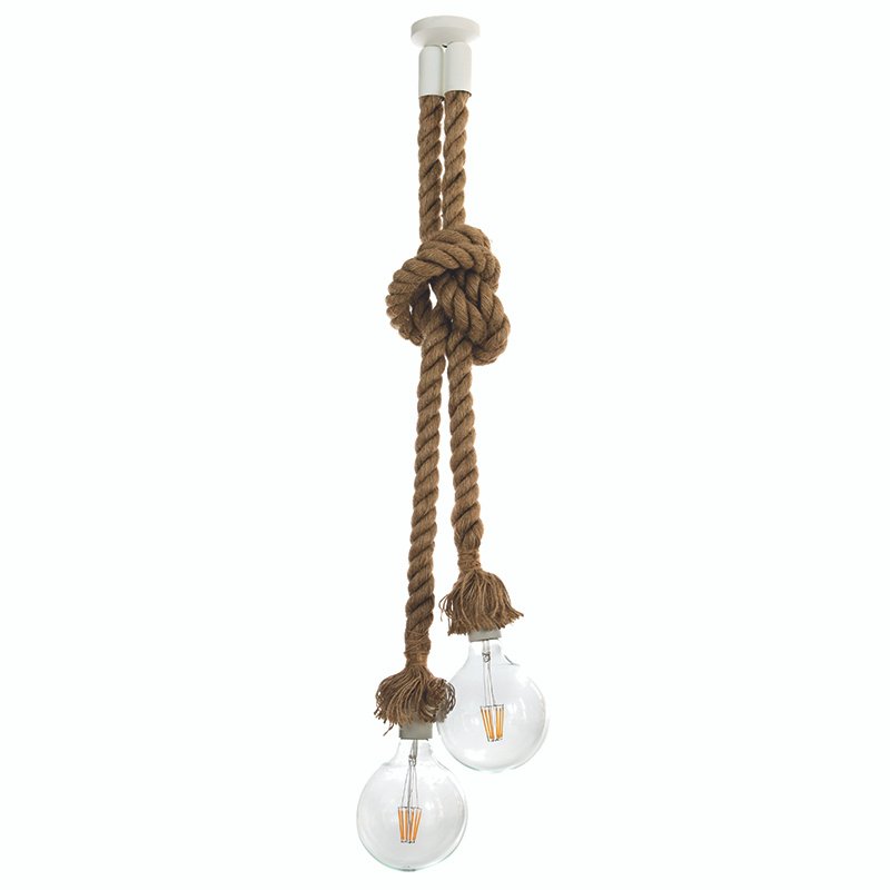 Κρεμαστό φωτιστικό από καφέ σχοινί που συνδυάζεται με λευκή μεταλλική λεπτομέρεια. Το φως διαχέεται ομοιόμορφα και η ανάρτηση μπορεί να ρυθμιστεί ώστε να προσαρμόζεται ιδανικά στον κάθε εσωτερικό χώρο.