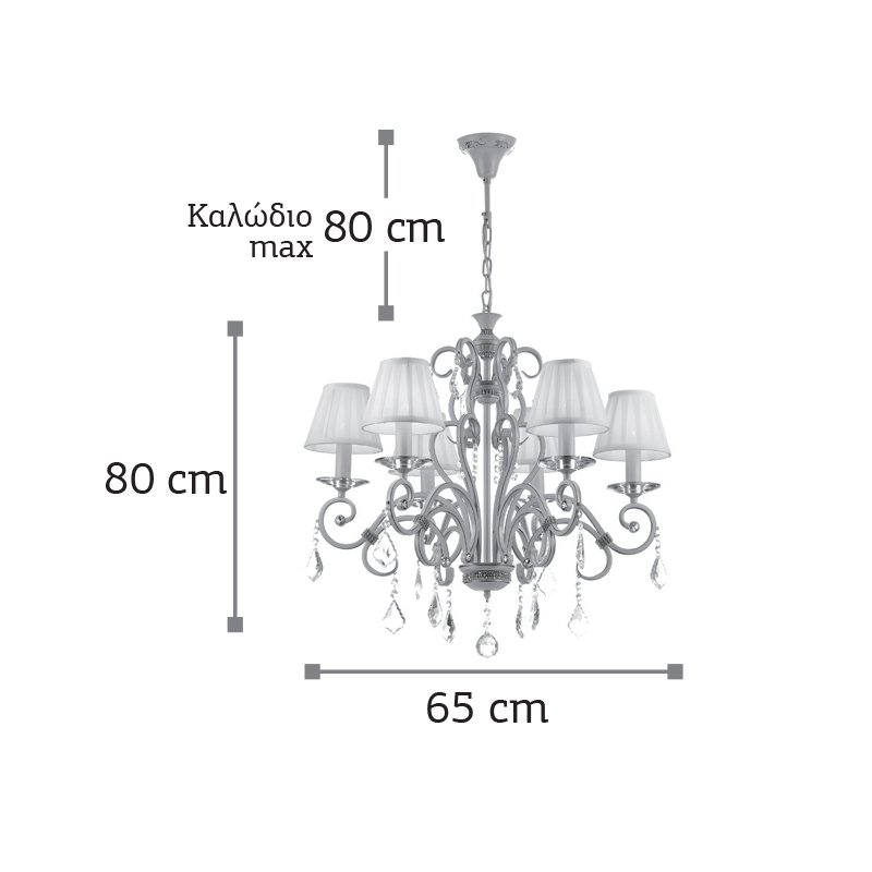Πρόκειται για ένα μπεζ μεταλλικό κρεμαστό φωτιστικό με έξι λαμπτήρες και διακριτική ύπαρξη κρυστάλλων. Τα μπεζ υφασμάτινα καπέλα που καλύπτουν τους λαμπτήρες δίνουν έναν απαλό φωτισμό στον χώρο. Η μεταλλική ανάρτηση είναι ρυθμιζόμενη ώστε να προσαρμοστεί στον κάθε χώρο.