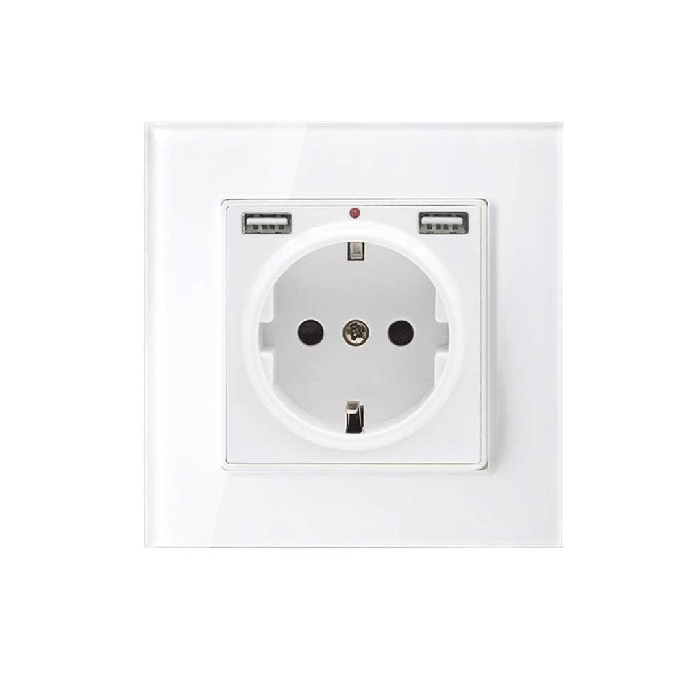 Πρίζα Σούκο με 2 υποδοχές USB, για να φορτίζετε πάντα τις συσκευές σας εύκολα και γρήγορα, με γυάλινη φάσα, διατίθεται σε λευκό και μαύρο, από υψηλής ποιότητας πλαστικό PC, με σύνδεση ουδετέρου και γείωσης, και οπτική ένδειξη λειτουργίας φόρτισης.