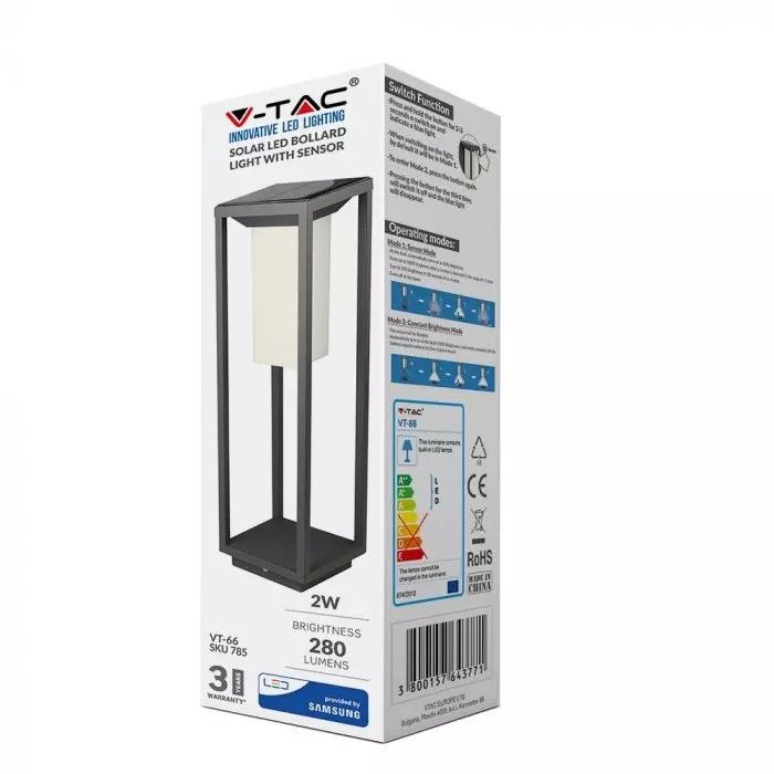 V-TAC 785 Ηλιακό Φωτιστικό Φαναράκι Επιδαπέδιο LED 2W SAMSUNG Chip Γκρι με 2 Λειτουργίες Θερμό Λευκό